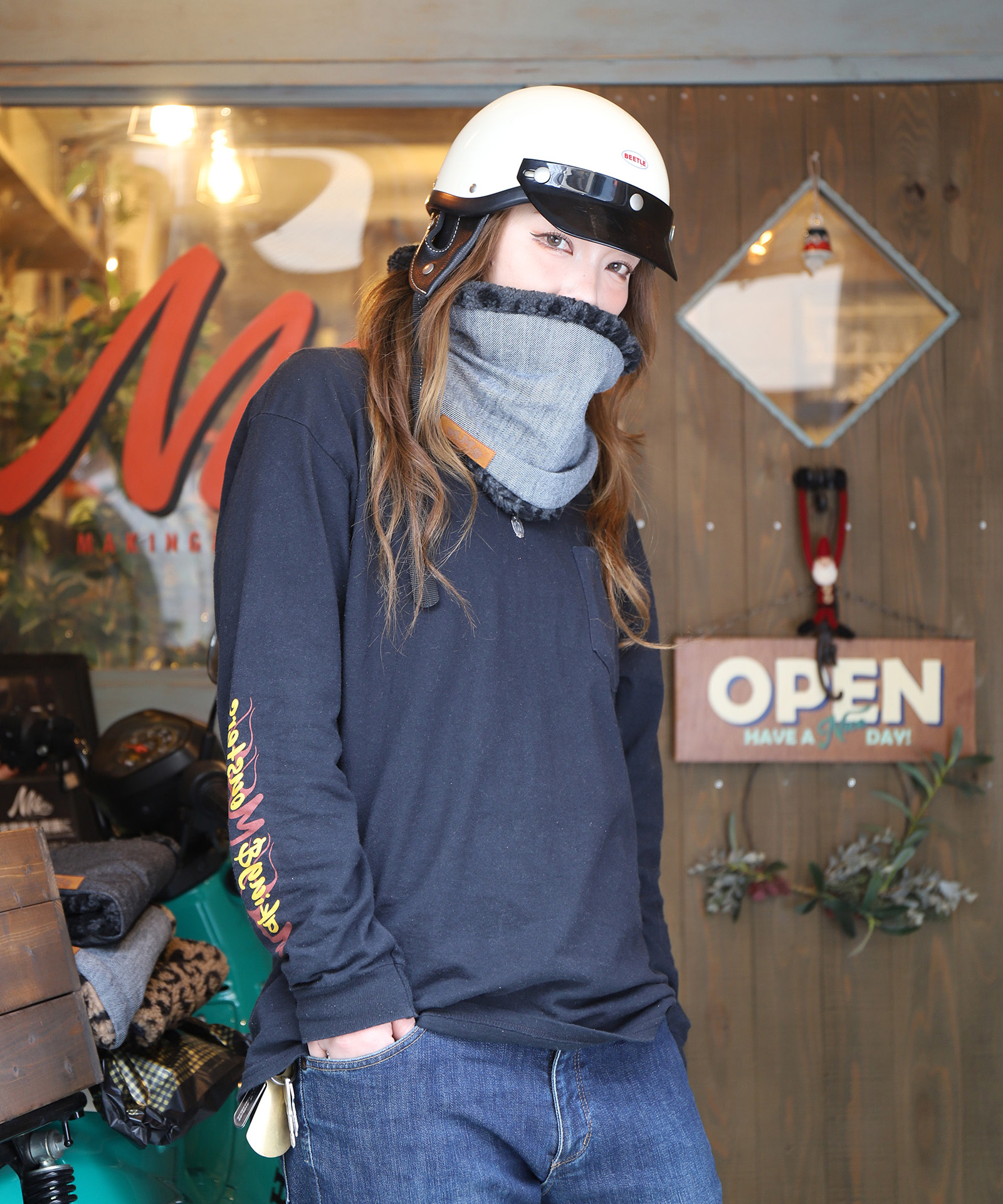 ヘルメット片手に歩きだす「普段使い」でも、マフラーのような自然なくたり感にこだわりました。また、そのフォルムを維持する独自の仕掛けも施し、どんな場面でもベストなシルエットをみせてくれます